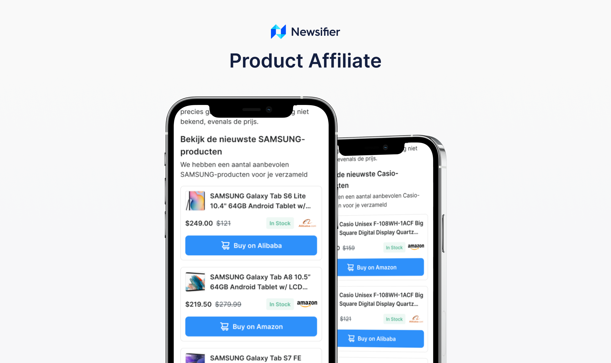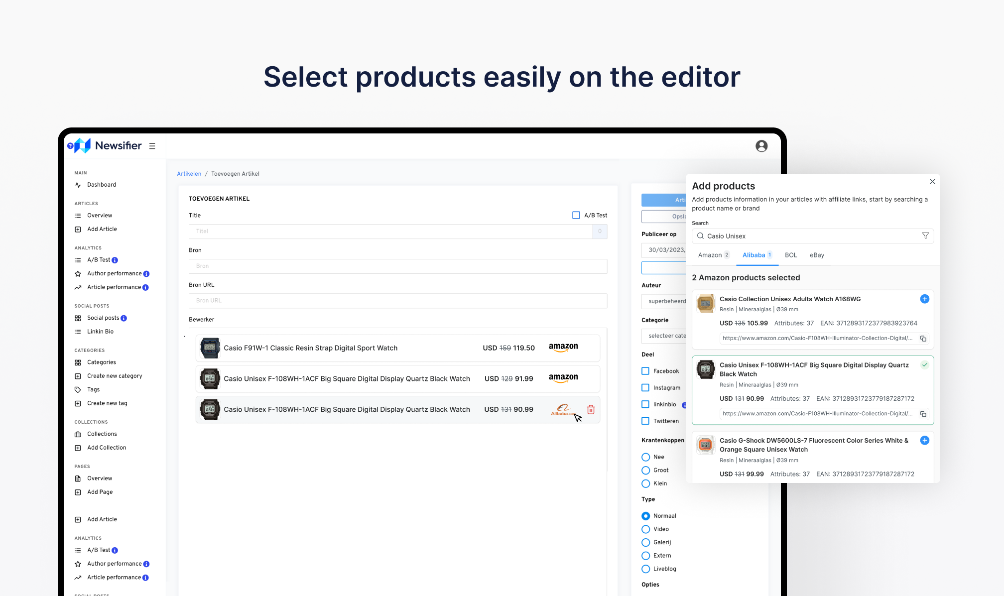 We're excited to launch a new feature soon that gives the possibility to publishers to embed affiliate products right into the editor by connecting many affiliate companies like Bol.com, Amazon.com, and awin.com straight to your website.